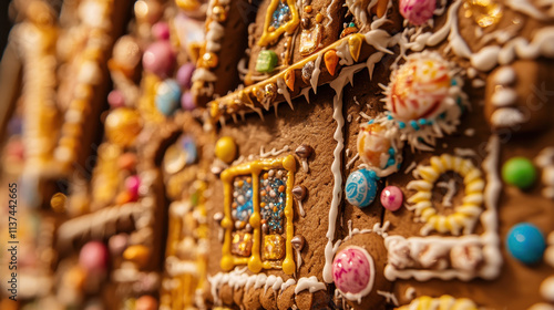 Naklejka premium A Close-Up View of an Ornate and Delicious Gingerbread House Decorated with Colorful Candies and Icings