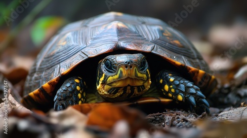 © shobakhul, Obraz premium A close up view of an ornate turtle on the forest floor