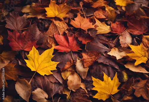 Fototapeta premium A close-up view of colorful autumn leaves scattered on the ground, featuring...