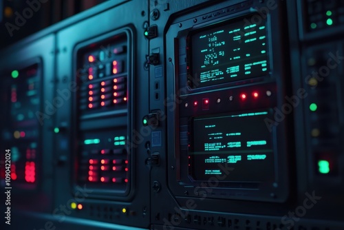 Obraz premium A close-up view of control panels with glowing lights and screens in a tech environment.