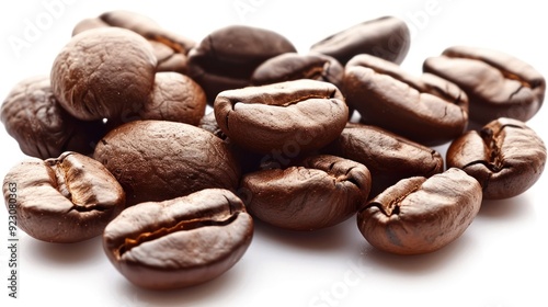 © AUNTYANN STUDIO, Naklejka premium A close-up view of dark roasted coffee beans with rich textures, showing the details of their shiny surfaces against a white background.