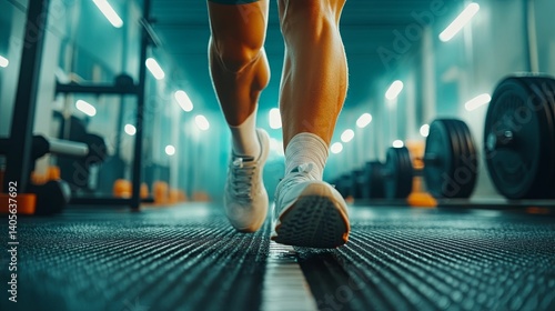 © Moonsterkat, Fototapeta premium A close-up view of feet walking on a gym floor.