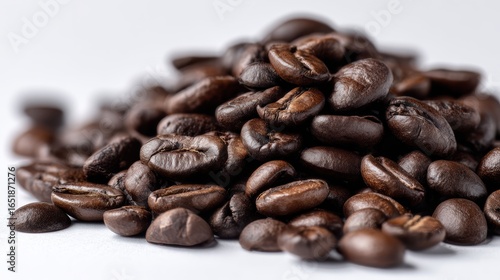 Fototapeta premium A close-up view of freshly roasted coffee beans arranged in a natural stack,...