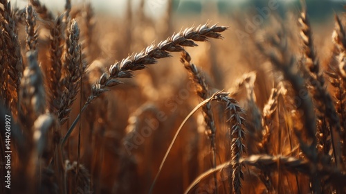 © Narin, Fototapeta premium A close-up view of golden wheat stalks swaying gently in the breeze, illuminated by warm sunlight, highlighting the beauty of agriculture.