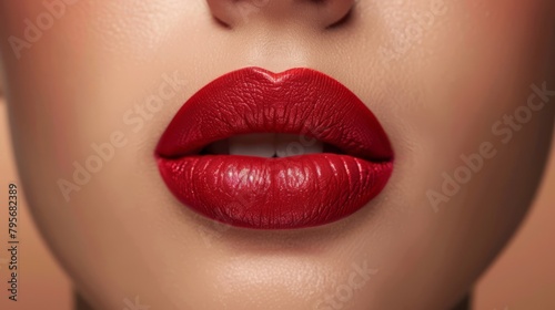 Obraz premium A close-up view of impeccably applied matte red lipstick, emphasizing the...