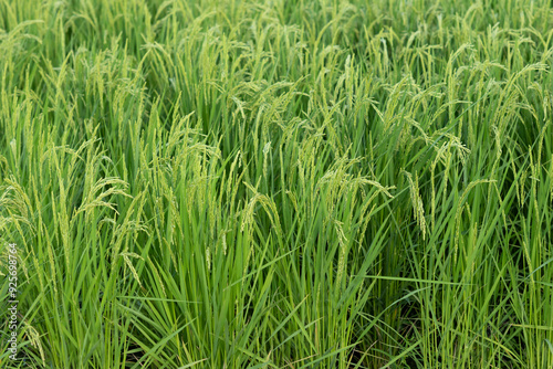 Obraz premium A Close-Up View of Lush Green Rice Plants in a Vibrant Field, Showcasing the Growth of Rice Grains as They Prepare for the Harvest Season in Rural Japan