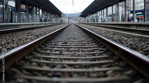 © Generative AI, Fototapeta premium A close up view of railway tracks leading into a distant train station under soft gray skies : Generative AI