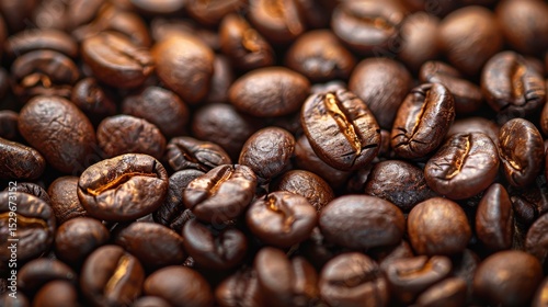 © Pinklife, Naklejka premium A close-up view of rich roasted coffee beans reveals their glossy texture and deep brown color, showcasing the essence of brewing and the passion for coffee culture.
