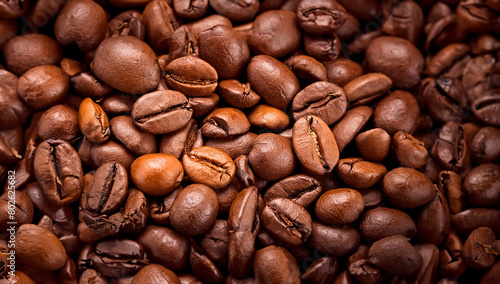 Naklejka premium A close-up view of richly textured, roasted coffee beans in varying shades of...