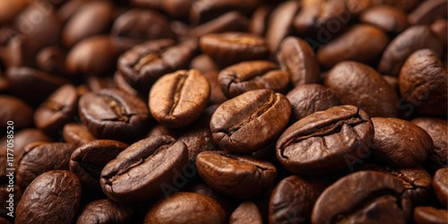 © Theerawat, Naklejka premium A Close-Up View of Roasted Coffee Beans, Rich Brown Hues and Detailed Textures