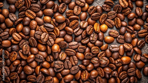 Fototapeta premium A close-up view of roasted coffee beans scattered on a rustic surface,...