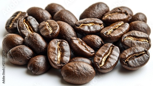 Obraz premium A close-up view of roasted coffee beans scattered on a white surface,...
