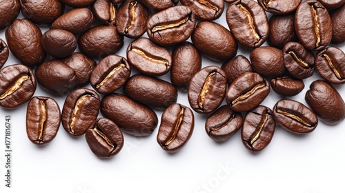 Fototapeta premium A close-up view of roasted coffee beans, showcasing their rich brown color and unique textures, perfect for coffee enthusiasts and culinary uses.