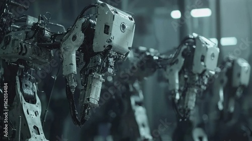 Fototapeta premium A close-up view of robotic arms in a dimly lit industrial setting, showcasing...