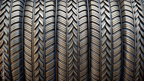 Fototapeta premium A close-up view of stacked tires showcasing intricate tread patterns in dark metallic tones