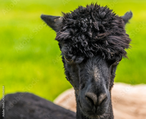 © Nicola, Obraz premium A close-up view of stern-looking black Alpaca in Charnwood Forest, UK on a spring day shot with face focus and blurred background