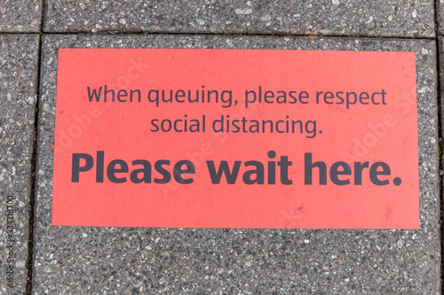 Obraz premium A close up view of taped off area on where to stand waiting to get into the supermarket during the cronavirus, covid-19 virus epidemic