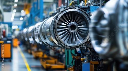 Fototapeta premium A close-up view of the turbine engine production line, where large jet engine...