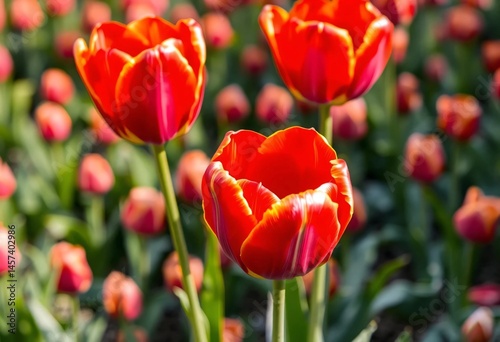 © Professor, Fototapeta premium A close-up view of three red tulips with yellow-edged petals in full bloom, set against a vibrant background of a dense tulip field. The rich colors and delicate details highlight the beauty of nature