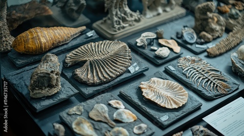 Fototapeta premium A Close-Up View of Various Fossils Displayed in a Museum Exhibit, Highlighting Geological History and Natural Artistry of Ancient Life Forms