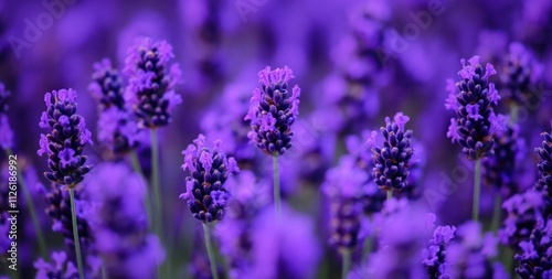 © BerkahStock, Naklejka premium A close-up view of vibrant lavender flowers in a field, showcasing their beauty and color.
