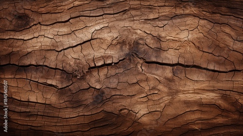 Obraz premium A close-up view of weathered wood showcasing deep cracks and a rich, textured surface, highlighting the natural beauty of timber.