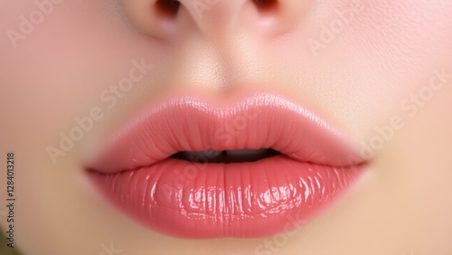 © Sohel, Fototapeta premium a close-up view of well-moisturized, slightly parted lips with a natural, glossy finish, emphasizing their detailed texture and natural color.