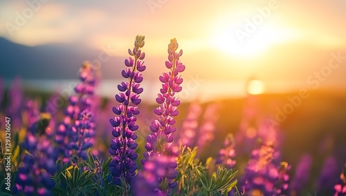 © Waqas, Naklejka premium A Close-Up View of Wild Lupine Flowers with Vibrant Purple and Pink Blooms, Featuring a Soft Green Background and Natural Lighting.