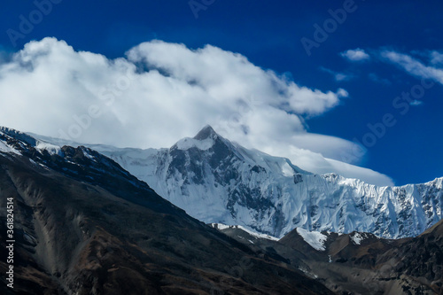 © Chris, Fototapeta premium A close up view on high, snow capped Himalayan peaks along Annapurna Circuit Trek in Nepal. Barren and sharp slopes. Exploration and discovering new places.
