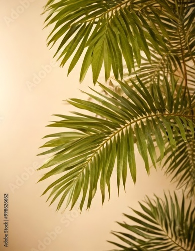 © Bualong, Naklejka premium a close-up view palm tree branch with its long, slender fronds against a light beige background