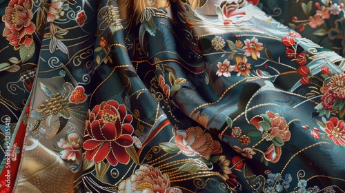 Naklejka premium A close-up view showcases the vibrant colors and elaborate floral embroidery of a traditional Japanese kimono