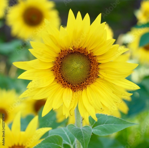 © Al, Naklejka premium A close view of the bright yellow sunflower in the field.
