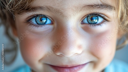 © Sonita, Fototapeta premium A closeup of a child’s face, with sparkling eyes and a joyful expression, set against a neutral background.