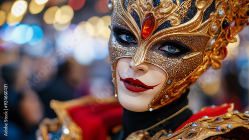 © fotogurme, Fototapeta premium A closeup of a cosplayer adjusting their detailed costume with the conventions bustling atmosphere in the background