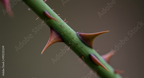© Putri, Obraz premium A closeup of a green stem with sharp reddishbrown thorns against a blurred brown background