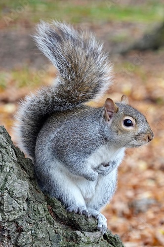 © Nigel Harris, Obraz premium A closeup of a grey squirrel, sciurus, carolinensis, with a bushy tail perching on a tree trunk in a park