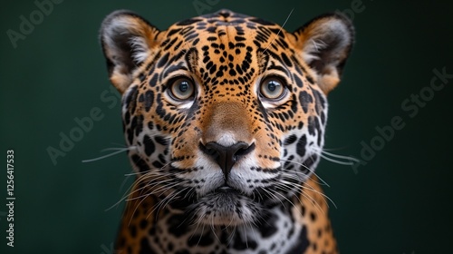 © Viacheslav, Fototapeta premium A closeup of a jaguar with piercing eyes and intricate rosette patterns on its fur set against a dark background