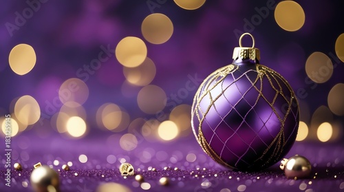 © SetCartoon, Fototapeta premium A closeup of a purple Christmas ornament with gold netting on a sparkly purple surface