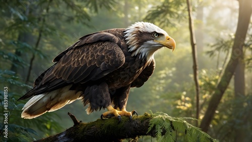 © Virdauso, Fototapeta premium A closeup of an American eagle perched on a tree branch with a determined look in its eyes