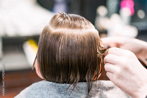 © R, Naklejka premium A closeup of boy's wet hair from his nape.