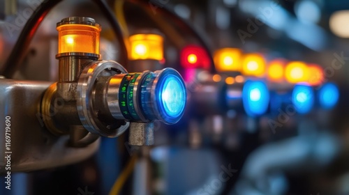 Fototapeta premium A closeup of sensors embedded in machinery with colorful LED indicators flashing representing the transition to smart technology in manufacturing systems.