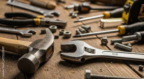 © Jewel, Fototapeta premium A closeup of various hand tools scattered on a wooden surface, including a hammer, wrench, screwdrivers, pliers, and nuts and bolts, creating a workshop scene