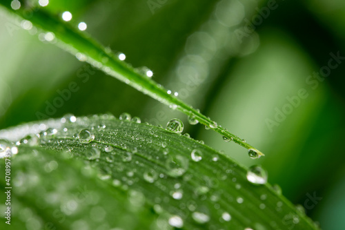 Naklejka premium A closeup of water drops on green leaf after raindrops
