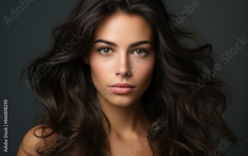 Fototapeta premium A closeup portrait of a beautiful brunette woman with green eyes, her hair flowing around her shoulders