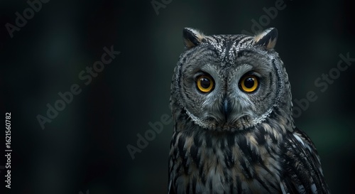 Fototapeta premium A closeup portrait of an owl with bright yellow eyes stares forward against a dark background