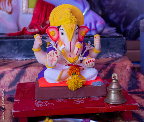 © lokesh, Fototapeta premium A Closeup shot Ganpati Installed in a Pandal during the 10 Day Ganesh Festival, the idols are immersed in heavy water bodies after the 10 days.