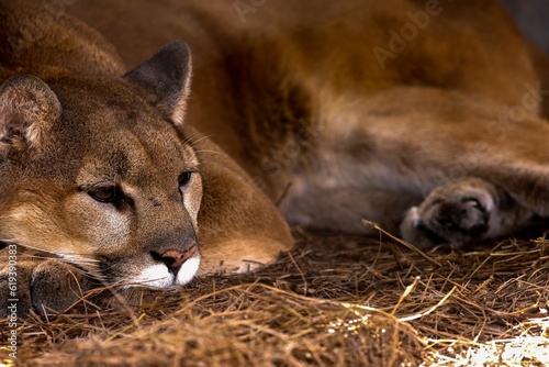 Naklejka premium A closeup shot of a beautiful brown panther laying on a bed of hay