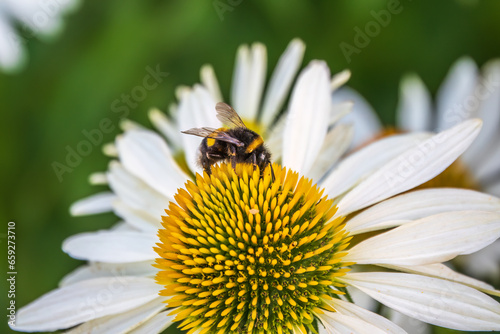 Fototapeta premium A closeup shot of a bee collecting pollen on a white echinacea flower