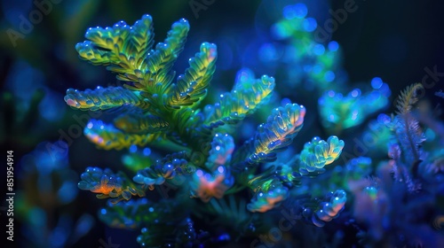 © JK_kyoto, Fototapeta premium A closeup shot of a bioluminescent plant glowing in a dark, hightech garden