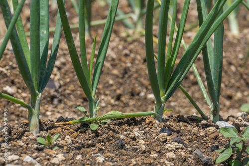 © Nailotl, Fototapeta premium A closeup shot of onions planted in the field